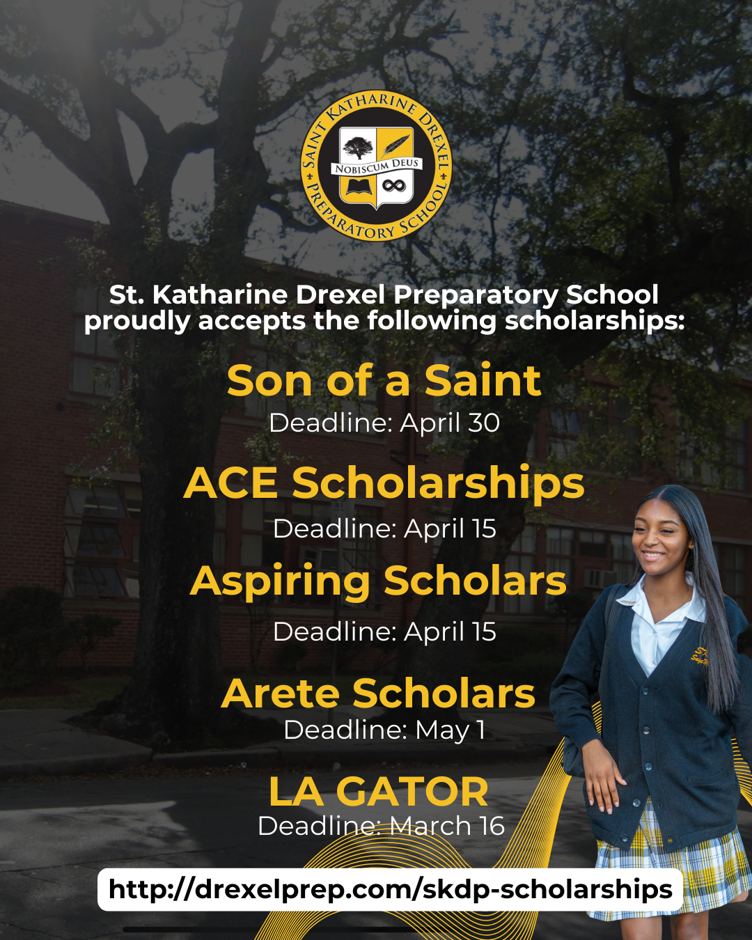 We accept Son of a Saint, Ace Scholarship, Aspiring Scholars, Arete Scholars and LA GATOR. More information about each scholarship is listed on their respective sites linked below. Please research each scholarship to determine which one is best for you.